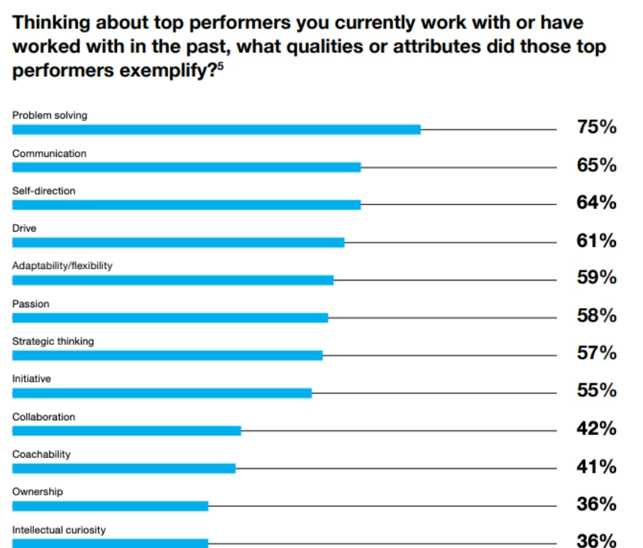In an Indeed survey conducted by Decipher/FocusVision, employers were asked what attribute their highest performer exemplified most. The top five answers were: